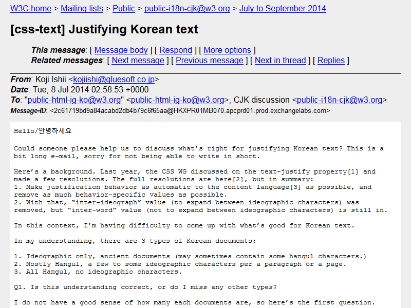 이 아래에는 일본의 Koji Ishii 씨가 w3.org 메일링리스트에 올린 “[css-text]Justifying Korean text(http://lists.w3.org/Archives/Public/public-i18n-cjk/2014JulSep/0002.html)” 전문을 번역한 글이 있습니다. 이 글에 포함된 Koji 씨의 질문 가운데 답하실 수 있는 어떤 내용이든 적어주시면 됩니다.