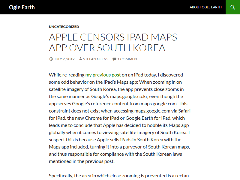 해당 블로그는 애플 얘기에 앞서 구글 지도가 한국 실정법을 어떤 식으로 지키고 있는지에 대해서도 글(http://ogleearth.com/2012/07/constraining-online-maps-the-case-of-south-korea/)을 남겼습니다. 남한과 북한의 구글 지도 정보의 차이점을 짚은 글입니다.
