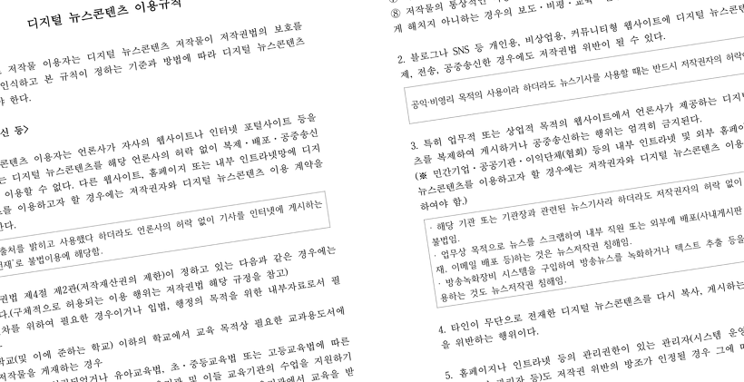 3. 특히 업무적 또는 상업적 목적의 웹사이트에서 언론사가 제공하는 디지털 뉴스콘텐츠를 복제하여 게시하거나 공중송신하는 행위는 엄격히 금지된다.